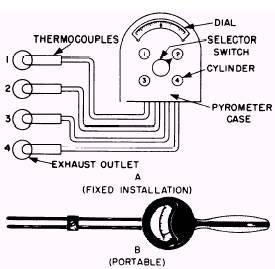 AND CYLINDER TEMPERATURES One of the most useful tools that the engine operator has for monitoring an engines performance is the thermocouple pyrometer. The principal use of this device is in the exhaust system (but it can also be used for other purposes) where it is used to measure the exhaust gas temperatures at each cylinder or the common temperature in the exhaust manifold. By comparing the exhaust gas temperatures of each cylinder, the operator can determine if the load is balanced throughout the engine. The two types of pyrometers in use are the fixed installation and the portable hand-held instrument (figure 3-5). Both types use a thermocouple unit, such as the one shown in figure 3-5, installed in the exhaust manifold. In its simplest form, a thermocouple consists of two dissimilar metal wires, usually iron and constantan (55% copper and 45% nickel) that are joined at both ends to form a continuous circuit. When the temperatures at the junctions are different an electrical current is produced and flows in the circuit. The greater the temperature difference, the greater the voltage produced. One junction, known as the hot junction, is contained in a closed-end tube, installed in the exhaust manifold of each cylinder. The other junction called the cold junction, is exposed to room temperature, and is located at the pyrometer wire