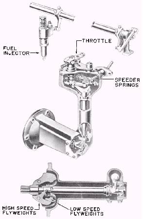 Figure 3-15.GM mechanical governor. (low speed) spring. Maximum speed control is effected by the action of the high speed (small) flyweights acting against a heavy (high speed) spring. (See figure 3-16.) Mechanical governor faults usually manifest themselves in speed variations; however, not all speed variations indicate governor faults. When improper speed variations appear do the following: 1. Check the load to be sure that speed changes are not the result of load fluctuations. 2. If the load is found to be steady, check the engine to be sure all cylinders are firing properly. 3. Make sure there is no binding in the gover-nor mechanism or operating linkage between governor and engine, and that no binding exists in the injector control rack shaft or its mounting brackets. If you find no binding anywhere and the governor still fails to control the engine prop-erly, you may assume the governor is worn or unfit for further service until the unit has been completely disassembled, inspected, and rebuilt or replaced.