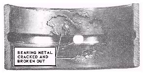 Figure 3-20.Bearing failure due to inadequate bond. loads on the main bearings because of the force that is necessary to retain correct alignment be-tween the bearing and the journal. A bent or misaligned connecting rod can be the cause of a ruined crank-pin bearing. Misalign-ment between the connecting rod bore and the piston pin bushing bore is indicated by the crack-ing of the bearing material at the opposite ends of the upper and lower-bearing shell. An indica-tion of a bent connecting rod is heavy wear or scoring on the piston surface. 7. Faulty installation, due to negligence or lack of experience. The paramount factor is inattention to cleanliness. Hard particles lodge between the bearing shell and the connecting rod bore, and create an air space. This space retards the normal flow of heat and causes localized high temperatures. Such condition may be further ag-gravated if the bearing surface is forced out into the oil clearance spaces and creates a high spot in the bearing surface. The result of a bearing failure is illustrated in figure 3-21. Foreign par-ticles, excessive clearance, or rough surface may cause poor contact between a bearing shell and a connecting rod. Poor contact is indicated by the formation of a gumlike deposit (sometimes re-ferred to as lacquer or varnish) on the back of the shell. Bearing failures may result from improper fit of the shell to the connecting rod. If the locking lip of a bearing does not fit properly into the recess of the bearing housing, distortion of the shell and failure of the bearing results.