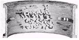 Figure 3-22.Overheated bearing. circulation, and sufficiently low to prevent excessive oxidation of the lubricating oil. Nor-mally, the manufacturers technical manual should be followed as to the correct lubricating oil temperature to maintain. However, if no manual is available, the temperature of the oil leaving the engine should be maintained between 160 and 200F. When possible, oil must be analyzed at recommended intervals to determine its suitability for further use. In addition, regular service of oil filters and strainers must be main-tained, and oil samples must periodically be drawn from the lowest point in the sump to determine the presence of abrasive materials or water. The lube oil purifier should be used in accordance with required procedures. Strict adherence to recom-mended practices will reduce the failure of bear-ings and other parts because of the contaminated oil or insufficient supply of clean oil. |