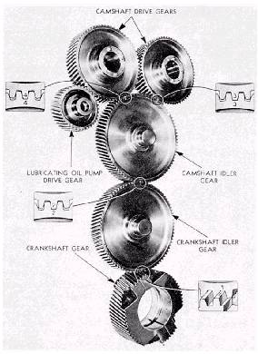 DRIVE MECHANISMS Auxiliary drive mechanisms are used in internal combustion engines to maintain a fixed and definite relationship between the rotation of the crankshaft and the camshaft. This is necessary in order that the sequence of events necessary for the correct operation of the engine may be carried out in perfect unison. Timing and the rotation of various auxiliaries (blowers, governor, fuel and lubricating oil pumps, circulating water pumps, overspeed trips, etc.) are accomplished by a gear or chain drive mechanism from the crankshaft. (Some small engine auxiliaries may be belt-driven.) GEAR MECHANISMS The principal type of power transmission for timing and accessory drives in most diesel engines is a system of gears similar to those shown in figure 3-24. In some of the larger engines, there may be two separate gear trains, one for driving the camshaft and the other for driving certain accessories. The type of gear employed for a particular drive depends upon the function it is to perform. Most gear trains use single helical spur gears, while governor drives are usually of the bevel type; reverse and reduction gear units employ double helical gears to balance fore and aft components of tooth pressure. Small gears are usually made from a single forging, while larger ones are quite often built up in split sections. (See the crankshaft gear in figure