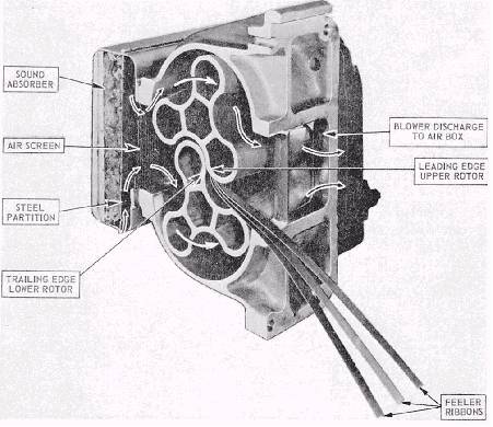 Figure 3-25.Checking clearance of positive displacement blower lobes. danger that the piston will strike valves that may be open and extending into the cylinder. Make certain that any gears removed are replaced in the original position. Special punch marks, or numbers (figure 3-24), are usually found on gear teeth that should mate. If they are not present, make identifying marks to facilitate the correct mating of the gears later. Bearing, bushing, and gear clearances must be properly maintained. If bushing clearances exceed the allowable value, the bushings must be re-newed. The allowable values for backlash and bushing clearances should be obtained from the instruction manual for the engine involved. Usually, a broken or chipped gear must be replaced. Care should be exercised in determin-ing whether a pitted gear should be replaced. |