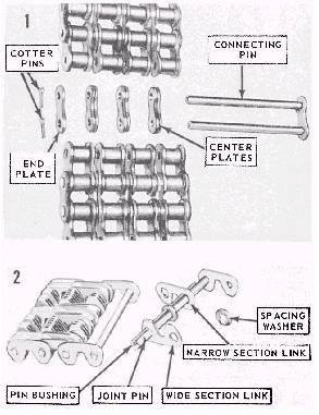 MECHANISMS In some engines, chains are not only used to drive camshafts and auxiliaries but also to drive such parts as rotating supercharger valves. Connecting links for two types of chains are shown in figure 3-27. Note that the connecting pins in one are secured by cotter pins, while the joint pins shown in the other are riveted. The principal causes of drive chain failure are improper chain tension, lack of lubrication, sheared cotter pins or improperly riveted joint pins, and misalignment of parts, especially idler gears. Chain drives should be checked for any symp-toms of such difficulties, in accordance with the instructions in the appropriate engine manual. The tension should be adjusted as required during