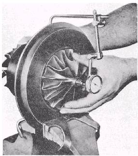 Figure 3-29.Checking shaft radial movement. speeds up to 75,000 rpm. Therefore, it is of utmost importance that turbochargers be maintained in proper working order at all times. If a turbocharger is allowed to operate without lubrication, cooling, or the proper clearances, it not only could be completely destroyed in a matter of minutes but also could possibly cause extensive damage to other machinery and personnel. All oil lines and air duct connections should be inspected and free of leakage. The air filter should be clean and in place and there should be no build-up of dust or dirt on the impeller. Turn the impeller by hand and check for binding or rub-bing and listen for any unusual noises. When the turbocharger is operating, listen for any unusual noise or vibrations. If you hear a shrill high pitch whine, shut down the engine at once. The whine may be caused by a failing bearing, and serious damage may result. Do not confuse the whine heard as the turbine runs down with that of a bad bearing. Noise from the turbocharger may also be caused by improper clearances between the turbine wheel and the turbine housing. The clearances should be checked at predetermined intervals in accordance with the PMS. Checking bearing axial end play and shaft radial movement are shown in figures 3-28 and 3-29, respectively. Crankcase vents should not be directed towards the turbocharger air intakes, as the corrosive gases may cause pitting of the blades and bearings, thereby reducing the life of the turbocharger.