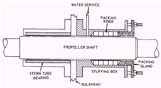 TUBE AND STERN TUBE BEARINGS The hole in the hull structure for accommodating the propeller shaft to the outside of the hull is called the stern tube. The propeller shaft is supported in the stern tube by two bearings one at the inner end and one at the outer end of the stern tubecalled stern tube bearings. At the inner end of the stern tube there is a stuffing box containing the packing gland (figure 4-4), which is generally referred to as the stern tube gland. The stern tube gland seals the area between the shaft and stern tube but allows the shaft to rotate. The stuffing box is flanged and bolted to the stern tube. Its casing is divided into two compartmentsthe forward space which is the stuffing box proper, and the after space, provided with a flushing connection, designed to maintain a positive flow of water through the stern tube for lubricating, cooling, and flushing. This flushing connection is supplied by the firemain. A DRAIN CONNECTION is provided both for testing for the presence of cooling water in the bearing and for permitting sea water to flow through the stern tube and cool the bearing when underway, where natural seawater circulation is employed. The gland for the stuffing box is divided longitudinally into two parts. The gland bolts are long enough to support the gland when the latter is withdrawn at least 1 inch clear of the stuffing