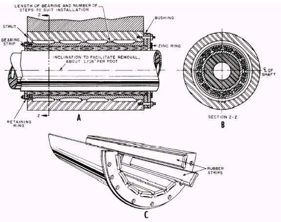 Figure 4-5.Details of underwater strut bearing. A. Longitudinal view. B. Cross-sectional view. C. Rubber stripping in the bearing. box. This permits the addition of a ring of new packing, when needed, while the ship is water-borne. Either braided flax packing or special semimetallic packing must be used (ships engineering drawings show the proper type of packing). This gland is usually tightened to eliminate leakage when the ship is in port, and is loosened (prior to warming up) just enough to permit a slight trickle of water for cooling purposes when the ship is underway. More recent shaft seal designs utilize packing only for emergencies. These newer seals are of two types; rubber face seals and mechanical face seals. Both face seals are on a plane perpendicular to the shafting, against a gland ring for rubber face seal or against a seal ring for a mechanical face seal. Further, most face seals require seawater for both cooling and lubrication. The rubber face consists of a rubber element that is clamped around the shaft just tightly enough to prevent rotational slippage and leakage underneath the seal, while at the same time, the seal is able to travel axially along the shaft. This axial motion is necessary so that the seal can maintain its position against the gland ring regardless of shaft position. The mechanical face seal is a ring made of either a hard synthetic or a carbon compound. This ring is held tightly against the seal ring by springs mounted behind it. NOTE: More information on face-type seals is available in manufactures technical manuals (Crane Co., Surface Ship, Seal Inc., Submarine). |