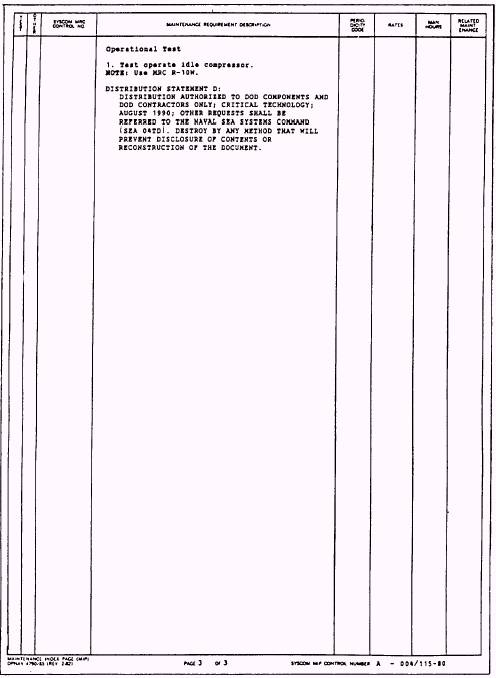 Figure 6-4.A maintenance Index page for low-pressure air compressor systems (page 3 of 3). manifold. In this case, medium-air pressure maintenance requirements are coupled with the HP air systems PMS. Troubles and repairs to medium-pressure systems are the same as the LP and HP air systems. Those medium-pressure air systems equipped with air compressors should have a separate preventive maintenance schedule. |