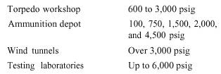 These systems provide compressed air within the range of 1,000 to 6,000 psig pressure. Hazards that increase with higher pressures and capacities can be minimized by using separate compressors for each required pressure. Systems operating at 3,000 psig may require small amounts of air at lower pressures, which is supplied through pressure-reducing stations. Always use caution with HP systems! When HP air enters suddenly into pockets or dead ends, the air temperature in the confined space increases dramatically. If there is any combustible material in the space and the air temperature increases to the ignition point of the material, an explosion may occur. Explosions of this type may set up shock waves that travel through the compressed air system. This travel may cause explosions at remote points. Even a small amount of oil residue or a small cotton thread may be sufficient to cause ignition. Some common pressure requirements for HP systems may be as follows: