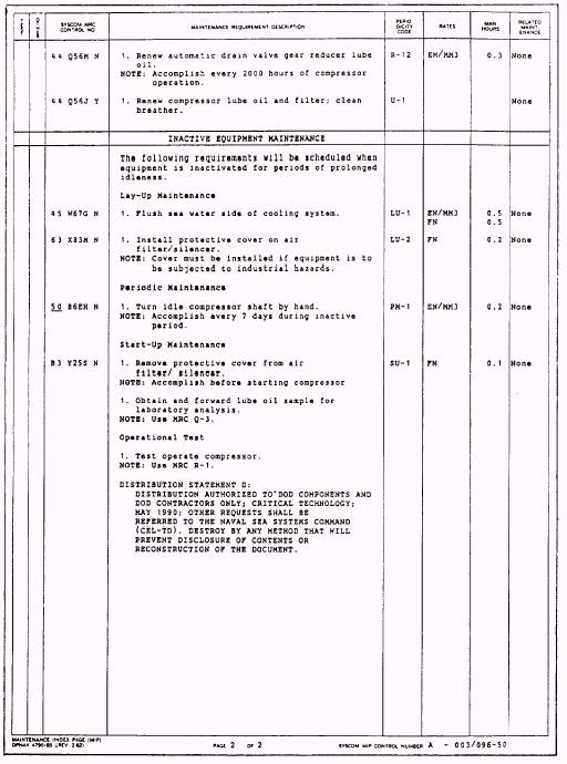 Figure 6-6.A maintenance index page (MIP) for one design and make of high-pressure air compressor systems (page 2 of 2). DEHYDRATOR DEW POINT READINGS This reading is taken every 4 hours of dehydrator service. Readings verify that the dehydrator is operating correctly. The normal readings of the various types of air dehydrators are as follows: 1. LP air (type I) dehydrators normal dew point reading is a dew point temperature reading of 40F or lower at 80 lb/in2. This indicates that the dehydrator is delivering an air quality within its design capability. A reading of 50F or higher at 80 lb/in2 indicates that the dehydrator is not working properly, and you should check the applicable technical manual. 2. A dew point temperature reading of -40F or lower at 80 lb/in2 is normal for LP (type II and type III) dehydrators. A reading of -20F or higher at 80 lb/in indicates that the dehydrator is not operating properly, and you should check the applicable technical manual to correct the problem. 3. For HP air dehydrators, a dew point temperature reading of -60F or lower at atmospheric pressure is normal. A reading higher than -60F at atmospheric pressure indicates that the dehydrator is not working properly, and you should check the technical manual for the solution to the problem. |