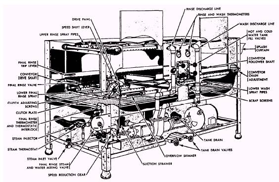 Figure 7-6.Cutaway view of a double-tank automatic dishwasher. 7. Lubricate the motor and pump bearings. 8. Lubricate, as necessary, the gear reducer unit. 9. Lubricate the conveyor shaft bearings, drive mechanisms, sprocket chains, and so on. 10. Replace any missing lubrication fittings. 11. Inspect all steam and water valves. 12. Disassemble and inspect pumps internally for undue erosion or corrosion at least annually. SUMMARY This chapter has presented some general information on maintenance and repairs of laundry, mess deck, galley, and scullery equipment. Maintenance personnel should make use of the manufacturers technical manual, the PMS, and other related NSTMs, which are furnished to all Navy ships. Table 7-4.Troubleshooting Chart for Scullery Machines