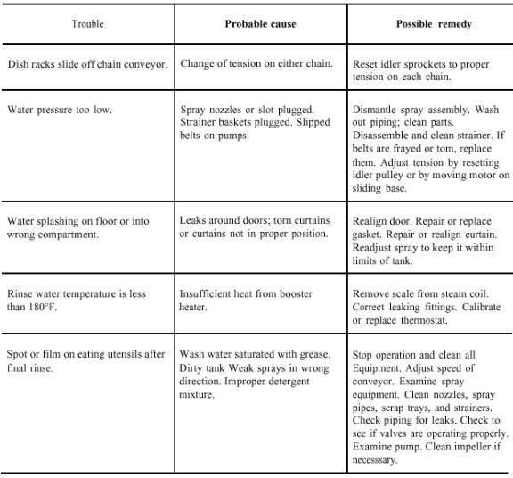 SCULLERY EQUIPMENT You must read the manufacturers instruction book for each machine and become familiar with all its operating characteristics and its basic design. If routinely cleaned, descaled, and properly maintained, scullery machines will not have any problems. But these procedures must be done on time as specified by the planned maintenance schedule or by the manufacturers manual. Any necessary repairs and parts replacement requests must be submitted by the responsible division on Ships Maintenance Action Form, OPNAV 4790/2K. Following this procedure and using this form will provide you, as the maintenance person, a document of repairs and parts that failed. TROUBLESHOOTING From time to time, you may be called upon to repair scullery machines that have become defective. Figures 7-5 and 7-6 illustrate the types of scullery machines used by the Navy. Some common difficulties, the usual reasons for their occurrence, and possible remedies for those difficulties are listed in table 7-4. REPAIRS OR OVERHAULS Scullery machines must be inspected by the maintenance personnel according to the PMS schedule. Listed here are some common inspections, maintenance, repairs, or overhauls you may encounter with these machines. You should perform the following: 1. Check the adjustment of tension on the conveyor chains if the machine is equipped with a conveyor. If the chain is equipped with lugs, make sure the lugs on both chains are directly opposite each other. 2. See that the guide sprockets are properly located on their shaft so that the conveyor chain will ride properly on the track assembly. 3. Inspect the operation of the doors and make sure all the counterweights are properly attached and the doors are held in the open position when raised. 4. Check the operation of thermometers, pressure gauges, thermostats, and automatic mixing valves or boosters. 5. Adjust the thermostat so that the machine will not start up unless the desired temperature is reached. 6. Inspect the pump packing and adjust as necessary to stop leakage around the pump shaft.
