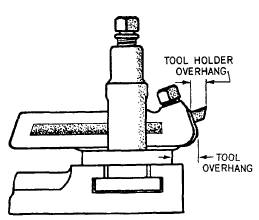 Figure 9-20.Tool overhang. CHECKING ALIGNMENT To turn a shaft straight and true between centers, be sure the centers are aligned in a plane parallel to the ways of the lathe. You can check the approximate alignment of the centers by moving the tailstockup until the centers almost touch and observing their relative positions as shown in figure 9-19. To test center alignment for very accurate work, take a light cut over at each end with a micrometer and, if readings are found to differ, adjust the tailstock accordingly. Repeat the procedure until alignment is obtained. SETTING THE TOOLHOLDER AND THE CUTTING TOOL The first requirement for setting the tool is to have it rigidly mounted on the tool post holder. Be sure the tool sets squarely in the tool post and that the setscrew is tight. Reduce overhang as much as possible to prevent the tool bit from springing during cutting. If the tool has too much spring, the point of the tool will catch in the work, causing chatter and damaging both the tool and the work The distances represented by A and B in figure