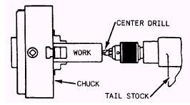 Figure 9-21.Drilling a center hole. 9-20 show the correct overhang for the tool bit and the holder. The point of the tool must be correctly positioned on the work Place the cutting edge. slightly above the center for straight turning of steel and cast iron and exactly on the center for all other work To set the tool at the height desired, raise or lower the point of the tool by moving the wedge in or out of the tool post ring. By placing the point opposite the tailstock center point, you can adjust the setting accurately. HOLDING THE WORK You cannot perform accurate work if the workpiece is improperly mounted. The requirements for proper mounting are as follows: 1. The work center line must be accurately centered along the axis of the lathe spindle. 2. The work must be held rigidly while being turned. 3. The work must NOT be sprung out of shape by the holding device. 4. The work must be adequately supported against any sagging caused by its own weight and against springing caused by the action of the cutting tool. There are four general methods of holding work in the lathe: (1) between centers, (2) on a mandrel, (3) in a chuck, and (4) on a faceplate. Work may also be clamped to the carriage for boring and milling, in which case the boring bar or milling cutter is held and driven by the headstock spindle. Other methods of holding work to suit special conditions are (1) one end on the live center or in a chuck and the other end supported in a center rest, and (2) one end in a chuck and the other end on the dead center. |