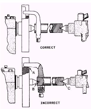 Figure 9-22.Examples of work mounted between centers. MOUNTING THE WORK.Figure 9-22 shows correct and incorrect ways to mount work between centers. In the correct example, the driving dog is attached to the work and held rigidly by the setscrew. The tail of the dog rests in the slot of the faceplate, without touching the bottom of the slot. The tail extends beyond the base of the slot so that the work rests firmly on both the headstock center and the tailstock center. In the incorrect example, note that the tail of the dog rests on the bottom of the slot on the faceplate at A and pulls the work away from the centers point, as shown at B and C. This causes the work to revolve eccentrically. In mounting work between centers for machining, be sure there is no end play between the work and the dead center. However, do not have the work held too tightly by the tailstock center. If you do, as the work revolves, it will heat the centers point, destroying both itself and the center. To help prevent overheating, lubricate the tailstock center with grease or oil. Holding Work on a Mandrel Many parts, such as bushings, gears, collars, and pulleys, require all the finished external surfaces to run true with their center hole, or bore. General practice is to finish the bore to a standard size within the limit of the accuracy desired. Thus a 3/4-inch standard bore would have a finished diameter of from 0.7495 to 0.7505 inch This variation is due to a tolerance of 0.0005 inch below and above the true standard of exactly 0.750 inch. First drill the hole to within a few thousandths of an inch of the finished size; then remove the remainder of the material with a machine reamer, following with a hand reamer if the limits are extremely close. Then press the piece on a mandrel tightly enough so the work will not slip while being machined Clamp a dog on the mandrel, which is mounted between centers. Since the mandrel surface runs true with respect to the lathe axis, the turned surfaces of the work on the mandrel will be true with respect to the bore of the piece. A mandrel is simply a round piece of steel of convenient length which has been center drilled and ground true with the center holes. Commercial mandrels are made of tool steel, hardened and ground with a slight taper (usually 0.0005 inch per inch). This taper allows the standard hole in the work to vary according to the usual shop practice and still provides a drive to the work when the mandrel is pressed into the hole. The taper is not great enough to distort the hole in the work The center-drilled centers of the mandrel are lapped for accuracy. The ends are turned smaller than the body of the mandrel and provided with flats, which give a driving surface for the lathe dog. |