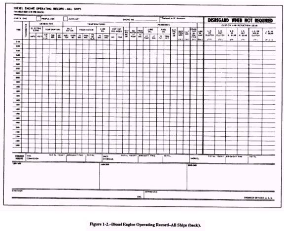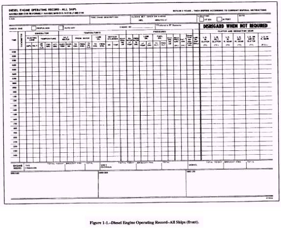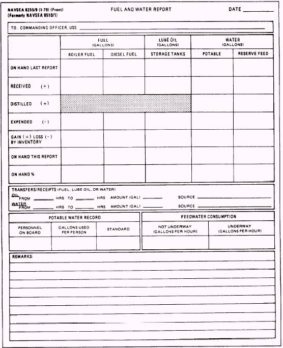 Figure 1-3.Fuel and Water Report (front). and fuel requirements data for budget justification. This report includes all fuel data as of 2400 hours of the last day of the month. Fleet commander instructions contain detailed instructions for completing the forms, as well as the definitions of the terms used. In addition to data on fuel inventory, the report contains space for fuel consumed underway, fuel consumed not underway, and fuel consumed by boats. Space is also provided for total steaming hours broken down as underway and not underway. Most engineer officers prefer to compile the necessary data for this summary on a daily basis rather than wait until the end of the month and make computations from the various records. If you prepare