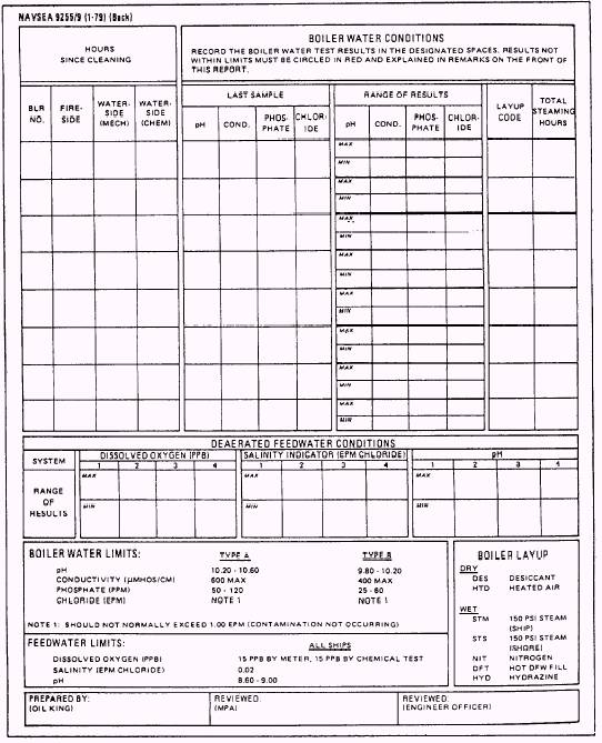 Fuel and Water Reports The Fuel and Water Report, NAVSEA 9255/9 (rev. 2-80) (figs. 1-3 and 1-4), is a report submitted daily to the commanding officer. This report indicates the amount of fuel oil and water on hand as of midnight, the previous day. The Fuel and Water Report also includes the previous days feed and potable water consumption figures and results of water tests. The original and one copy are submitted to the OOD in sufficient time for submission to the commanding officer or command duty officer with the 1200 reports. The copy is retained by the OOD. Monthly Summary The Monthly Summary of Fuel Inventory and Steaming Hours Report, CINCLANTFLT 3100-4, is a comprehensive monthly report of engineering data. These data are used to calculate the operating efficiency and general performance of the ships engineering plant (see fig. 1-5). Requirements for this report are contained in fleet commander instructions. The engineer officer prepares the report, has the supply officer verify the fuel receipt figures, and forwards it to the commanding officer. The commanding officer approves the report and sends it directly to the fleet commander. One copy is retained on board in the files of the engineering department. An additional copy of the report may be provided to the type commander. The Monthly Summary includes the ships fuel receipts data, fuel consumption and steaming hours necessary to establish monthly financial obligations,