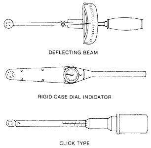 Figure 2-11.Typical torque wrenches. select the torque wrench with the correct capacity. The torque value should be in the second or third quarter of the wrenchs torque scale because the first and last quarters of the scale are not as accurate as the middle quarters. Torque wrenches are precision tools. Handle them with care and always follow the manufacturers manual when you use them. |
