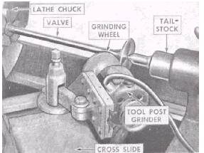 Figure 3-15.Facing a valve on a lathe. Do not reinstall springs with nicks, cracks, or surface corrosion. Replace them. To minimize corrosive conditions, use clean lube oil, eliminate water leaks, and keep vents open and clean |