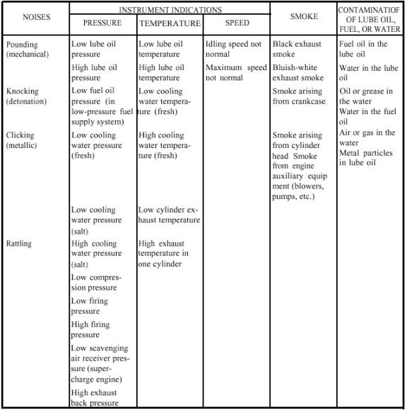 SYMPTOMS OF ENGINE TROUBLE In learning to recognize the symptoms that may help locate the causes of engine trouble, you will find that experience is the best teacher. Even though written instructions are essential for efficient troubleshooting, the information usually given serves only as a guide. It is very difficult to describe the sensation that you should feel when checking the temperature of a bearing by hand; the specific color of exhaust smoke when pistons and rings are worn excessively; and, for some engines, the sound that you will hear if the crankshaft counterweights come loose. You must actually work with the equipment to associate a particular symptom with a particular trouble. Written information, however, can save you a great deal of time and eliminate much unnecessary work. Written instructions will make detection of troubles much easier in practical situations. A symptom that indicates that trouble exists may be in the form of an unusual noise or instrument indication, smoke, or excessive consumption or contamination of the lube oil, fuel, or water. Figure 3-43 is a general listing of various trouble symptoms that you may encounter. NOISES The unusual noises that may indicate that trouble exists or is impending may be classified as pounding, knocking, clicking, and rattling. Each type of noise must be associated with certain engine parts or systems that might be the source of trouble. Pounding or hammering is a mechanical knock (not to be confused with a fuel knock). It may be caused by a loose, excessively worn, or broken engine part. Gen-erally, troubles of this nature will require major repairs. Detonation (knocking) is caused by the presence of fuel or lubricating oil in the air charge of the cylinders during the compression stroke. Excessive pressures accompany detonation. If detonation is occurring in one or more cylinders, stop the engine immediately to prevent possible damage. Clicking noises are generally associated with an improperly functioning valve mechanism or timing gear. If the cylinder or valve mechanism is the source of metallic clicking, the trouble may be due to a loose valve stem and guide, insufficient or excessive valve tappet clearances, a loose cam follower or guide, broken valve springs, or a valve that is stuck open. A clicking in the timing gear usually indicates that there are some damaged or broken gear teeth. Rattling noises are generally due to vibration of loose engine parts. However, an improperly functioning vibration damper, a failed antifriction bearing, or a gear-type pump operating without prime are also possible sources of rattling noises. When you hear a noise, first make sure it is a trouble symptom. Each diesel engine has a characteristic noise at any specific speed and load. The noise will change with a change in speed or load. As an operator, you must become familiar with the normal sounds of the engine. Investigate all abnormal sounds promptly. Knocks that indicate a trouble may be detected and located by special instruments or by the use of a sounding bar, such as a solid iron screwdriver or bar. INSTRUMENT INDICATIONS As an engine operator, you will probably rely more on the instruments to warn you of impending troubles than on all the other trouble symptoms combined. Regardless of the type of instrument being used, the indications are of no value if the instrument is inaccurate. Be sure an instrument is accurate and operating properly before you accept a low or high reading. Test all instruments at specified intervals or whenever you suspect them of being inaccurate. SMOKE Smoke can be quite useful as an aid in locating some types of trouble, especially if used in conjunction with other trouble symptoms. The color of exhaust smoke, a good indication of engine performance, can also be used as a guide in troubleshooting. The exhaust of an efficiently operating engine has little or no color. A dark, smoky exhaust indicates incomplete combustion; the darker the color, the greater the amount of unburned fuel in the exhaust. Incomplete combustion may be due to a number of troubles. Some manufacturers associate a particular type of trouble with the color of the exhaust. The more serious troubles are generally identified with either black or bluish-white exhaust colors.