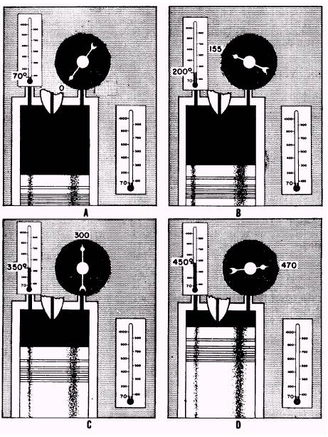 of Ignition When the gases within a cylinder are compressed, the temperature of the confined gases rises. As the compression increases, the temperature rises. In a gasoline engine, the compression temperature is always lower than the point at which the fuel will ignite spontaneously. Thus, the heat required to ignite the fuel must come from an external source (spark plug). This method is referred to as SPARK IGNITION. On the other hand, the compression temperature in a diesel engine is far above the ignition point of the fuel oil. Therefore, ignition of the fuel takes place as a result of heat generated by compression of the air within the cylinder, an action referred to as COMPRESSION IGNITION. The difference in the methods of ignition indicates that there is a basic difference in the combustion cycles upon which diesel and gasoline engines operate. The difference involves the behavior of the combustion gases under varying conditions of pressure, tem-perature, and volume. Since this is so, you should be familiar with the relationship of these factors before considering the combustion cycles individually. (The basic laws and processes involved in a volume, temperature, and pres-sure relationship are discussed under the proper-ties of gases in Fireman, NAVEDTRA 10520-H.) You should also be aware that compression ratio (clearance volume) refers to the comparison between the volume above the piston at BDC to the volume above the piston at TDC. Relationship of Temperature, Pressure, and Volume The relationship of temperature, pressure, and volume as found in an engine can be illustrated by a description of what takes place in a cylinder that is fitted with a reciprocating piston. Follow views A through D in figure 2-4. Note the instruments that indicate the pressure within the cylinder and that the temperature both inside and outside the cylinder is approximately 70F. Assume the cylinder is an airtight container, as it is in our example. Now compare views A and B of figure 2-4. If a force pushes the piston toward the top of the cylinder, the entrapped charge is compressed. In views B and C, the compression progresses. The VOLUME of the air DE-CREASES, the PRESSURE INCREASES, and the TEMPERATURE RISES. These changing conditions continue as the piston moves. When the piston nears TDC in view D, there has been a marked decrease in volume. Also, both pressure and temperature are much greater than at the beginning of compression. Notice that the pressure has gone from 0 psi to 470 psi and