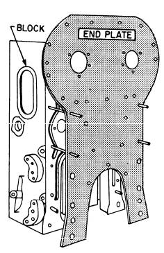 Figure 3-5.Front end plate on a cylinder block. the structure of an engine. The reservoir may be called a sump or an oil pan, depending on the design of the engine. In most engines, the reservoir is usually attached directly to the engine. In dry sump engines, however, the oil pan merely catches the lubricating oil as the oil drains through the engine. As the lubricating oil reaches the oil pan, it immediately drains by gravity flow from the oil pan to a reservoir (that is located apart from the engine) where the lube oil for the engine is collected so it can be cooled and filtered. It is from this reservoir that the engine is supplied with lubricating oil and not from the oil pan. Thus, in dry sump engines, the oil pan remains essentially dry. Regardless of the design of the engine, the oil reservoir serves the same purpose wherever it is located. |