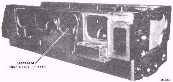 Many engines, especially the larger ones, have openings in some part of the engine frame. (See figs. 3-4 and 3-6.) These openings permit access to the cylinder liners, main and connecting rod bearings, injector control shafts, and various other internal engine parts. Access doors are usually secured with handwheel or nut-operated clamps and are fitted with gaskets to keep dirt and foreign material out of the interior of the engine. On some engines, the covers (sometimes called