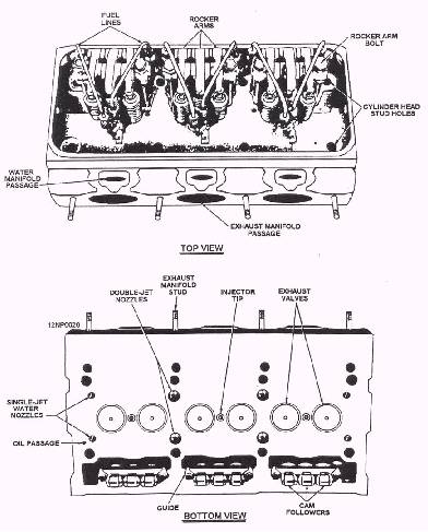 Figure 3-15.A multiple cylinder head for a V-type engine.. of cylinders, is a one-piece casting which can be removed from the engine as an assembly containing such moving parts as the cam followers and guides, push rods, rocker arms, exhaust valves, and fuel injectors. The cylinder head shown in views A, B, and C of figure 3-16 is used when one cylinder head is required for each cylinder. The cylinder head is made of high-strength, cast-iron alloy with specially designed cast passages for water and exhaust gases. Drilled holes (view C) at the bottom of the cylinder head match the water discharge holes in the liner. Other passages in the cylinder head line up with mating elbows in the cylinder block to conduct exhaust gases through the water manifold to the exhaust manifold. Another opening located in the center of the cylinder head (view A) is where the fuel injector is installed. Another cylinder head of the type used to seal one cylinder of a block is shown in figure 3-17. This cylinder head is different in construction compared to the heads we have discussed. The cylinder heads shown in figures 3-15 and 3-16 must be removed from the block before the exhaust valves can be serviced. The cylinder head in figure 3-17, however, features a caged design that allows for replacement of the exhaust valves and seats in minimal time without removal of the secured cylinder head. When the intake valves re-quire servicing, the cylinder head must be removed from the block. Additional information on valves is contained in chapter 4 of this manual. |