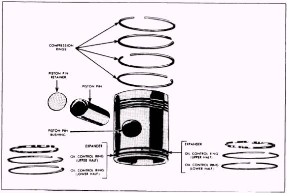 Figure 4-12.Typical piston, piston rings, pin, and relative location of parts. of compression and oil rings. Some common variations are illustrated in figure 4-13. |