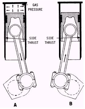 Figure 4-14.Trunk-type piston in a single-action engine showing side thrust. film between the piston and the cylinder wall, metal-to-metal contact occurs and results in excessive wear. If the clearance between the piston and cylinder wall is excessive, a pounding noise, called PISTON SLAP, will occur as the thrust alternates from side to side. |