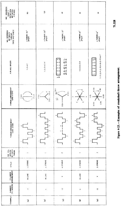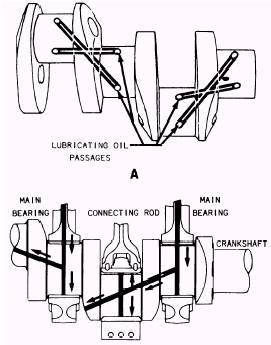 AND LUBRICATION Whether a crankshaft is of solid construction (fig. 4-19) or of hollow construction (fig. 4-20), the main journals, the connecting rod journals, and the webs of most shafts have drilled passages for lubricating oil. Two other variations in the interior arrangement of oil passages in crankshafts are shown in figure 4-22. A study of these two
