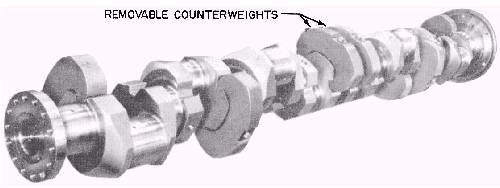Figure 4-21.Crankshaft with removable counterweights. oil passage arrangements will give you an idea of the part the crankshaft plays in engine lubrication. In the system illustrated in view A of figure 4-22, each oil passage is drilled through from a main bearing journal to a connecting rod journal. The oil passages are in pairs that crisscross each other in such a way that the two oil holes for each journal are on opposite sides of the journal. These holes are in axial alignment with the oil grooves of the bearing shells when the shells are in place. Since the oil groove in a bearing goes at least halfway around the bearing, a part of the groove will always be aligned with at least one of the holes. In the oil passage arrangement shown in view B of figure 4-22 (the shaft is shown in fig. 4-19), the passage is drilled straight through the diameter of each main and connecting rod journal. A single diagonal passage is drilled from the outside of a crankshaft web to the center of the next main journal. The diagonal passage connects the oil passages in the two adjoining connecting rod journals and main journals. The outer end of the diagonal passage is plugged. Lubricating oil under pressure enters the main bearing and is forced through the diagonal passage to lubricate the connecting rod bearing. From there it flows through the drilled con-necting rod to lubricate the piston pin and cool the piston. In engines that use crankshaft oil passage arrangements such as those just discussed, the connecting rods are drilled to carry the lubricating oil to the piston pins and piston. (Refer to fig. 4-17.) Not all engines have drilled connecting rods. In some V-type engines, drilled passages supply oil to the main and connecting rod bearings, but oil for the lubrication and cooling of the piston assembly may be supplied by centrifugal force or by separate supply lines. Variations in engine lubricating systems are discussed later in chapter 8.