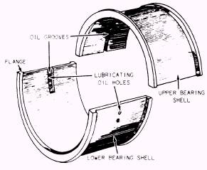 BEARINGS As mentioned in chapter 3, the bearings of an engine make up an important group of parts. Bearings serve to support rotating shafts and other moving parts and to transmit loads from one part of the engine to another. Engine bearings consist of two basic types: antifriction bearings and friction bearings. Both types are used in Navy diesel engines. ANTIFRICTION BEARINGS Antifriction bearings can be grouped into six general classifications: ball bearings, cylindrical roller bearings, needle bearings, tapered roller bearings, self-aligning roller bearings, and thrust bearings. The use of antifriction bearings is mostly limited to the exterior areas of an engine. You will find them in use in cooling pumps, fuel-injection pumps, governors, starters, flywheel pilot bearings, turbochargers, and blowers. All antifriction bearings employ a rolling element (rollers, balls, or needles) between the inner and outer rings (races). Either the inner ring or the outer ring will remain stationary. (Refer to fig. 4-24 for cutaway views of two types of antifriction bearings.) Because of the small contact area between the rolling elements and the inner and outer rings and the necessity for the bearing to withstand the high compression stress, the material used for the construction of roller bearings is usually carbonized steel alloy and that used for ball bearings is usually heat-treated chromium-alloy steel.