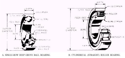 Figure 4-24.Cutaway view of a ball bearing and roller bearing. As an Engineman, you will come into contact with various items of equipment that may require bearing replacement. Bearings that are similar in appearance may not be suitable as replacement bearings. Ball and roller bearings are identified by a numerical code which indicates the bore in millimeters or sixteenths of an inch. The internal fit, or tolerance, and any special characteristics are also coded by number. Letter codes indicate the type of bearing, the outside diameter (OD), the width of the cage, the seal or shield, the modification, and the required lubricant. |