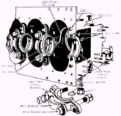 Figure 4-26.Main bearings in a cylinder block. These types of bearings are called THRUST bearings. Some engines use separate flat thrust washers, as shown in figure 3-8 of chapter 3, on each side of one main bearing to control the crankshaft thrust (back and forth movement). Main bearings and their housing and caps are precision machined with a tolerance sufficiently close that, when properly installed, the bearings are in alignment with the journals and fit with a predetermined clearance. The clearance provides space for the thin film of lubricating oil which is forced, under pressure, between the journals and the bearing surfaces. Under normal operating conditions, the film of oil surrounds the journals at all engine load pressures. Lubricating oil enters the bearing shells from the engine lubricating system, through oil grooves in the bearing shells. (See figs. 4-25 and 4-26.) These inlets and grooves are located in the low-pressure area of the bearing. Main bearings are subjected to a fluctuating load, as are the connecting rod bearings and the piston pin bearings. However, the manner in which main journal bearings are loaded depends on the type of engine in which they are used. In a 2-stroke cycle engine, a load is always placed on the lower half of the main bearings and the upper half of the piston pin bearings. In the connecting rod, the load is placed upon the upper half of the connecting rod bearings at the crankshaft end of the rod. This is true because the forces of combustion are greater than the inertial forces created by the moving parts. In a 4-stroke cycle engine, the load is applied first on one bearing shell and then on the other. The reversal of pressure is the result of the large forces of inertia imposed during the intake and exhaust strokes. In other words, inertia tends to lift the crankshaft in its bearings during the intake stroke and exhaust stroke. Additional information on bearings can be found in Naval Ships Technical Manual, chapter 244. |