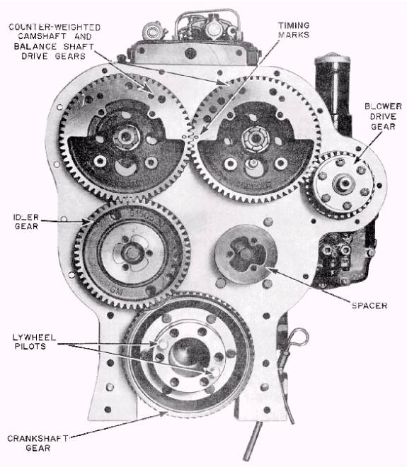 Figure 5-1. Camshaft and accessory drive (General Motors 6-71). example of such an engine. A complete assembly that transmits power from the driving part to the driven part, the operating mechanism of the GM 71 consists of gears, shafts, and couplings. |