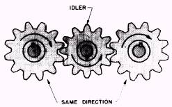 GEARS When the driving mechanism of an engine consists only of gears, the mechanism is commonly called a gear train. In a gear train, the gears must be accurately cut and heat-treated to resist wear. Helical teeth (teeth placed at an angle) are frequently used in place of spur teeth (teeth placed straight) for greater quietness and more uniform trans-mission of power. Gears and shafts are used in various arrangements to drive the vital components and accessories of the engine. The gear train for a GM 6-71 engine is shown in figure 5-1. (The arrangement shown is designed for right-hand rotation.) The gear train of a GM 71 functions as both the camshaft drive and the accessory drive. The train consists of five helical gears completely enclosed at the rear end of the engine. Note that all gears are driven by the crankshaft gear through an idler gear. An idler gear is placed between two other gears to transfer motion from one gear to the other without changing their direction. The use of a single idler gear is shown in figure 5-2. In the GM 71 shown in figure 5-1, the idler gear may be located on either the right or left side of the engine, depending upon the direction of the crankshaft rotation. (Locate the spacer, or dummy hub.)