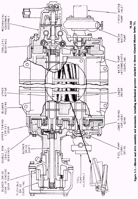Figure 5-2.Idler gear. Since the engine operates on a 2-stroke cycle, the camshaft and balancer gears are driven at the same speed as the crankshaft gear. Either the cam-shaft gear or the balancer gear may be driven by the crankshaft gear through the idler gear; the drive arrangement depends on the model (right-or left-hand rotation). The camshaft and balance shaft gears are counterweighted for balance purposes. The accessories of the GM 71 receive power from the blower drive gear, which is driven by the camshaft gear (fig. 5-1). Located on the blower side of the engine and supported by the rear end plate, the blower drive gear transmits power to the blower, governor, water pump, and fuel pump, as shown in figure 5-3. Figure 5-3 also shows the location of the various engine accessories and the shafts, gears, and couplings that transmit the power from the blower drive gear to each of the accessories. The blower end of the governor drive shaft is serrated or splined, and it engages with corresponding serrations or splines inside the upper blower shaft. The fuel pump is bolted to the rear cover of the blower and is driven from the lower blower rotor shaft, through a device that acts as a universal joint. The water pump is mounted on the front end of the blower and is driven by the rotor shaft, through a coupling. (See fig. 5-3.)