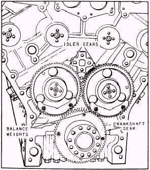 MECHANISMS FOR A 2-STROKE CYCLE, V-TYPE DIESEL ENGINE The in-line engine discussed in the preceding section requires only one drive mechanism (gear train) to transmit power to the valve actuating gear and engine accessories. Our discussion will now cover an engine that uses two separate gear drives (gear trains), one at each end of the engine. The front gear train, as shown in figure 5-4, consists of a crankshaft gear and two idler gears. The idler gears serve to drive the water pump (not shown) and balance the engines. (See balance weights.) The rear gear train (fig. 5-5) consists of a crankshaft gear, three idler gears, and two cam-shaft gears. The rear idler gears, like the front, also serve to balance the engine. (See balance weights.) The two other gears that are mounted on the rear of the engine as shown in figure 5-5