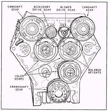 Figure 5-6.Rear gear train timing marks on a 16-V 149 series Detroit diesel engine. because (1) power is supplied by two crankshafts in an opposed-piston engine, instead of one, and (2) the camshaft drives of the engines we have discussed thus far supply power to one or more accessories as well as to the valve-actuating gear. This is not true of the camshaft in an opposed-piston engine since ports are used instead of valves for both intake and exhaust. Regardless of differences in mechanisms, the basic types of drivesgear and chain are found in both single-acting and opposed-piston engines. While the two engines described in preceding sections had only gear-type drive mechanisms, the opposed-piston engine used as an example in this section has chain assemblies as well as gear trains incorporated in the mechanisms that supply power to engine parts and accessories. The Fairbanks-Morse (FM) opposed-piston engine has three separate drive mechanisms. The drive that furnishes power to the camshaft and fuel-injection equipment is the chain type. The blower and the accessories are operated by gear-type drives. The location of each drive is shown in figure 5-7. |