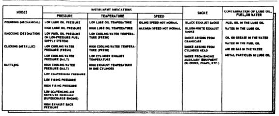 OF ENGINE TROUBLE When learning to recognize the symptoms that may help you locate the causes of engine trouble, you will find that experience is the best teacher. Even though written instructions are essential for efficient troubleshooting, the information usually given will serve you only as a guide. It is very difficult to describe the sensation you should feel when you are checking the temperature of a bearing by hand; the specific color of exhaust smoke when pistons and rings are worn excessively; and, for some engines, the sound you will hear if the crankshaft counter-weights come loose. You must actually work with the equipment before you can associate a particular symptom with a particular problem. Written information, however, can save you a great deal of time and can help you eliminate unnecessary work. Written instructions will make your detection of problems much easier in practical situations. Symptoms that indicate trouble may be in the form of an unusual noise or instrument indication, smoke, excessive consumption of lube oil, or contamination of the lube oil, fuel, or engine coolant. Figure 11-1 provides a general listing of various trouble symptoms the operator of an engine may encounter. For additional information, you should consult the Naval Ships Technical Manual, chapters 079 and 233. Noises Unusual noises that may indicate that a trouble exists (or is impending) are classified as pounding, knocking, clicking, and rattling. You must be able to associate each type of noise with certain engine parts or systems that might be the source of the trouble. Pounding or hammering is a mechanical knock (and should not be confused with a fuel knock). Pounding or hammering may be caused by a loose, excessively worn, or broken engine part. Generally, troubles of this nature will require major repairs. Detonation (knocking) is caused by the presence of fuel or lubricating oil in the air charge of the cylinders during the compression stroke. Excessive cylinder pressures accompany detonation. If detonation is occurring in one or more cylinders, you should stop the engine immediately to prevent possible damage.