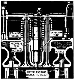 Most engines have cooling-water passages within the cylinder head. In the cylinder head, these passages generally surround the valves. In diesels, the water passages also surround the in-jectors. Usually, the passages are cast or drilled as an integral part of the head. In some cylinder heads, such as those of various General Motors engines (fig. 7-15), each injector is inserted into a thin-walled copper tube that passes through the water space in the cylinder head. This design