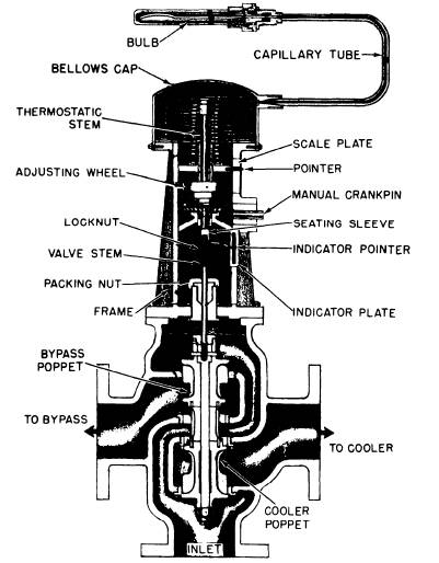 OPERATED BYPASS VALVES In marine diesel engine installations, automatic temperature control by means of thermostatically operated bypass valves is more common than control by means of throttling valves in the seawater circuit. When used in the jacket-water system, these valves are located between the point where the jacket water leaves the engine block and the component that cools the water. The thermostatic valves used in the cooling systems of engines are of two types: the conventional type, which is also used in automotive engines (an example of this type is shown in fig. 7-16); and the three-way proportioning type (figs. 7-17 and 7-19). Valves of the latter type are commonly called automatic temperature regulators. Conventional thermostatic valves are generally used in small engines; the automatic temperature regulators are commonly used in medium and large engines.