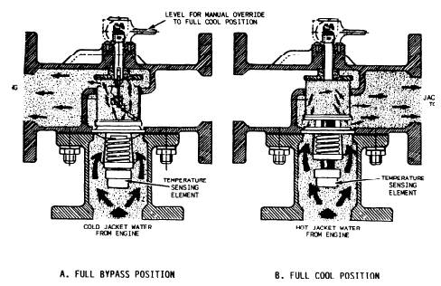 Figure 7-19.-Three-way temperature regulating valve operation. sensing or activating element in this valve is a power pellet. The power pellet contains a special wax material (similar to that in the conventional thermostatic valve) that expands with tremendous force as it changes from a solid to a liquid when heat is applied. In this valve (as in the conventional thermostatic valve), the important characteristic of the sensing element is that when the wax material is fully liquefied, expansion stops. The manufacturer uses a different formulation to establish a suitable operating range and limiting action for each three-way automatic regulating valve. The sensing element for each of these valves is set at the normal temperature rating by the manufacturer and cannot be altered once the rating has been set. If a different rating is required, a new valve must be used. The three-way temperature regulating (con-trol) valve that is located in the freshwater circuit automatically regulates jacket-water flow to the jacket-water cooler to maintain optimum water temperature. These valves are arranged so that flow is normally through the recirculating line which bypasses the cooler and permits the jacket water to be recirculated through the engine. (See fig. 7-19, view A.) In this way, the temperature of the jacket water rises and the valve starts to open. When the jacket water in contact with the valve element starts to exceed normal operating temperature, the valve fully opens to permit full flow to the jacket-water cooler where the excessive heat is given up. (See fig. 7-19, view B.) It should be noted that the applications of conventional thermostatic valves or automatic regulating valves we have discussed do not control the rate of water flow through the cylinder jackets but vary the flow through whatever cooling medium is used. This design provides for the control of the temperature of the jacket water without a reduction in the rate of flow in the engine that might cause localized hot spots. When located in the seawater circuit, the regulator controls the amount of seawater flowing through the coolers. When the tem-perature of the fresh water becomes greater than the temperature for which the regulator is set, the regulator actuates a valve to increase the flow of seawater through the coolers. When the temperature of the fresh water is below the temperature for which the regulator is set, the regulator actuates a valve to decrease the flow of seawater through the coolers. Temperature regulators are used not only to control the temperature of the fresh water but also to control indirectly the temperature of the oil discharge from the lubricating oil cooler. Control of lubricating oil temperature is possible because the water that is passed through the regulator and the freshwater cooler is the cooling agent in the lubricating oil cooler. |