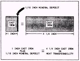 CHEMICALS The chemicals you will use for treating fresh water in engine cooling systems will vary according to the composition of the metal you are trying to protect, the application of the engine, and the climate to which the engine is subjected. Because of these variations, our discussion of engine cooling system treatments will be general. Complete information on this subject can be obtained in the Naval Ships Technical Manual, chapter 233. Our discussion will cover some of the chemicals that are authorized for the treatment of freshwater systems in engines. Remember, however, that the water treatment methods that will be discussed in this chapter are preventive treatments only. These treatments will not remove scale that has already formed in the cooling system. A CORROSION INHIBITOR is a water-soluble chemical compound that protects the metallic surfaces of the cooling system against corrosive attack. Depletion of all types of inhibitors occurs through normal operation, Therefore, strength levels must be maintained by addition of inhibitors as required after the coolant is tested. The importance of a properly inhibited coolant cannot be overstressed. A coolant that has insufficient inhibitors, the wrong inhibitors, or worse, no inhibitors at all invites the formation of rust and scale deposits within the cooling system. Rust, scale, and mineral deposits can wear out water pump seals and coat the walls of the cylinder block water passages and the outside walls of the cylinder liners. As these deposits build up, they insulate the metal and reduce the rate of heat transfer. For example, a 1/16-inch deposit of rust or scale on 1 inch of cast iron is equivalent to 4 1/4 inches of cast iron in heat transferability. (See fig. 7-20.) An engine affected in this manner overheats gradually-over a period of weeks or months. Liner scuffing, scoring, piston seizure, and cylinder head cracking are the inevitable results. An improperly inhibited coolant may also become corrosive enough to eat away coolant passages, erode seal ring grooves, and cause leaks to develop. If sufficient coolant accumulates on top of a piston, a hydrostatic lock can occur while the engine is being started. This, in turn, can result in a bent connecting rod. As a precaution against these possibilities, an engine should be barred over by hand before being started. An improperly inhibited coolant can also contribute to cavitation erosion. Cavitation erosion is caused by the collapse of bubbles (vapor pockets) that form on the coolant side of an engine component. The collapse results from a pressure differential in the liquid caused by the vibration of the engine part. As bubbles collapse,