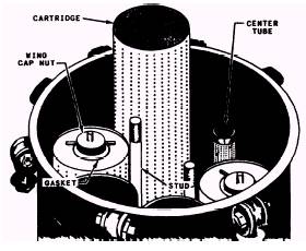 Filters In filters approved by the Navy, the absorbent material is composed of such substances as cellulose, cotton yarn, and paper disks. Filters may be located directly in the pressure-lubricating oil system, or they may be installed as bypass filters. When installed in the pressure system, a filter must contain a built-in, spring-loaded, pressure-relief valve. The valve must be large enough to bypass all oil to the engine in case the filter element becomes restricted. A bypass filter has an orifice plate in the line to the filter. This component controls the amount of oil removed from the lubricating oil pressure system. (The amount of oil that flows through a bypass filter is only a small percentage of the oil that flows through the pressure system.) The oil from a bypass filter is returned to the sump tank. Filters vary as much in design and construc-tion as do strainers. Examples of some of the filters with which you will come into contact are shown in figures 8-6 and 8-8. TANK-TYPE FILTER.-Figure 8-6 illus-trates the basic design of a tank-type filter. A tank-type filter consists of a single tank that holds