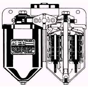 Figure 9-4.-Primary fuel metal-edge strainer. either strainer to be completely cut out of the system for cleaning or repair while all of the fuel flows through the other strainer. Figure 9-4 shows a typical metal-edge strainer. A magnified view of a portion of the element is shown in figure 9-5. The fuel flows from the outside to the inside. In Navy-approved strainers, the spaces between the leaves, or ribbons, which act as fuel passages, are between 0.001 and 0.0025 inch. The pressure drop across these strainers must not be allowed to exceed 1.5 psi when a fuel flow is equal to the full capacity of the fuel pump. In some engines, a duplex strainer is placed between the fuel supply tank and the transfer pump and, during operation, may be working under a vacuum. The secondary, cartridge-type, fuel filter contains elements that must conform to Navy specifications. The pressure drop across clean and new elements should not be allowed to exceed 4.5 psi. The elements should be changed when the pressure drop reaches the value specified in the manufacturers instruction book. The sump of the filters and strainers should be drained as often as practicable, preferably when the fuel is flowing. |