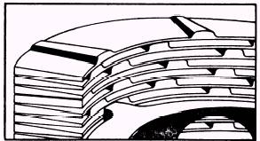 Figure 9-5.-Enlarged section of ribbon in strainer. Centrifugal purifiers are used for purification of both fuel and lubricating oil. A purifier may remove both water and sediment, or it may remove sediment only. When water is involved in the purification process, the purifier is usually called a SEPARATOR. When the principal contaminant is dirt or sediment, the purifier is used as a CLARIFIER. Purifiers are generally used as separators for the purification of fuel. When used for purification of a lubricating oil, a purifier may be used as either a separator or a clarifier. Whether a purifier is used as a separator or a clarifier depends on the water content of the oil that is being purified. NOTE: According to the Naval Sea Systems Command (NAVSEA) at the time of the writing of this training manual, purifiers are not authorized for use with diesel engine lubricating oil systems. The following general information will help you understand the purification process, the purposes and principles of purifier operation, and the basic types of centrifugal purifiers in use in naval service. |