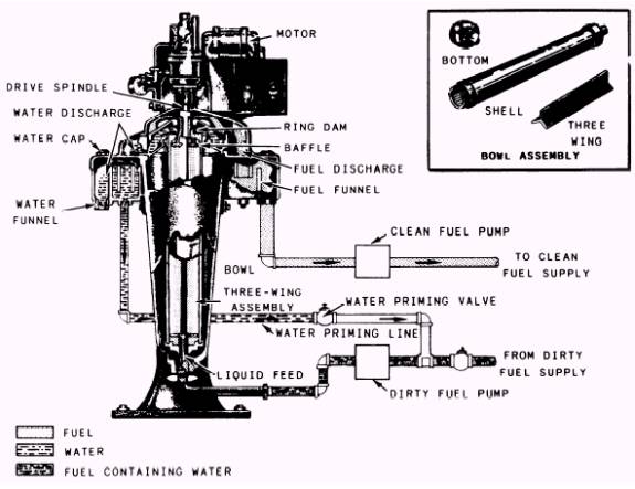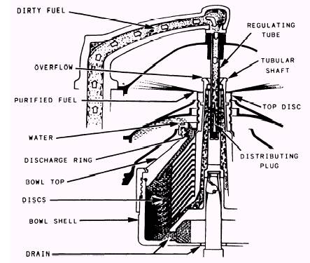 Purifier A cross section of a tubular-type centrifugal purifier is shown in figure 9-9. This type of purifier consists essentially of a hollow rotor or bowl which rotates at high speeds. The rotor has an opening in the bottom to allow the dirty fuel to enter. It also has two sets of openings at the top to allow the fuel and water to discharge. The bowl, or hollow rotor, of the purifier is connected by a coupling unit to a spindle. The spindle is suspended from a ball bearing assembly. The bowl is belt-driven by an electric motor mounted on the frame of the purifier. The lower end of the bowl extends into a flexibly mounted guide bushing. The assembly restrains movement of the bottom of the bowl, but it also allows the bowl enough movement to center itself during operation. Inside the bowl is a device consisting of three flat plates that are equally spaced radially. This device is commonly referred to as the THREE-WING DEVICE, or