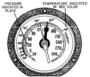 GAUGES AND THERMOMETERS A number of pressure gauges and thermometers are used in refrigeration systems. Figure 16-18 shows a compound R-12 gauge. The temperature markings on this gauge show the boil-ing point (or condensing point) of the refrigerant at each pressure; the gauge cannot measure temperature directly. The fixed pointer (usually red) can be set manually to indicate the minimum or maximum allowable working pressure.