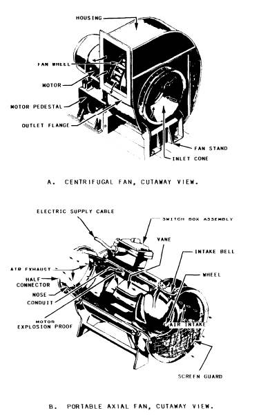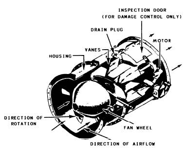 Figure 17-5.-Ventilating fans. to exhaust explosive or hot gases. However, they may be used in place of axial-flow fans if they work better with the arrangement or if their pressure-volume characteristics suit the installa-tion better than an axial-flow fan. Centrifugal fans are also used in some fan-coil assemblies, which are discussed later in this chapter. PORTABLE FANS Portable axial fans, such as the example in view B of figure 17-5, are used with flexible air hoses aboard ship for ventilating holds and cofferdams. They are also used in unventilated spaces (voids) to clear out stale air or gases before personnel enter and for emergency cooling of machinery. Most portable fans are the axial-flow type, driven by electric, explosion-proof motors. On ships carrying gasoline, a few air turbine-driven centrifugal fans are normally provided. You can place greater confidence in the explosion-proof characteristics of these fans. |